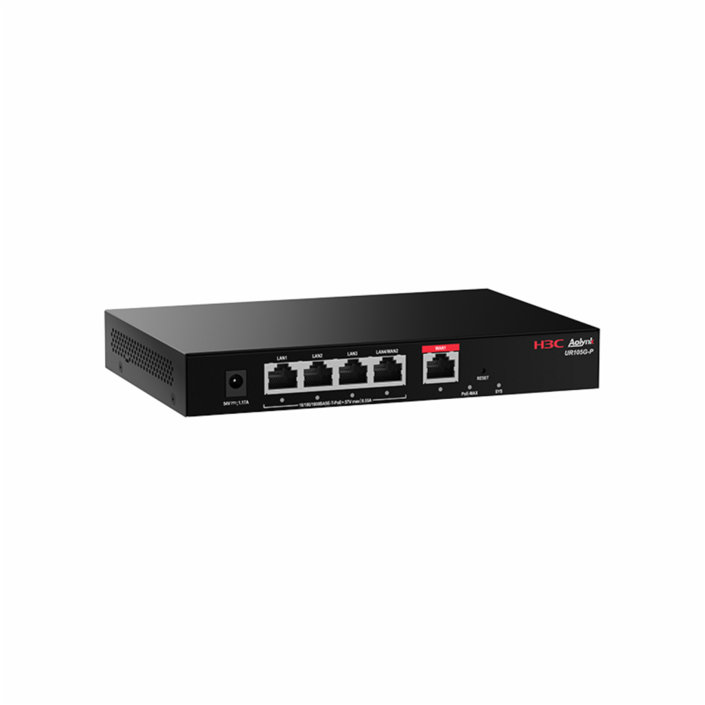 H3C UR105G-P — это компактный маршрутизатор-гейтвей с поддержкой 5 Gigabit портов, включая PoE-питание на LAN-порт(ы). Он предназначен для подключения локальной сети к интернет-каналу, обеспечивает базовые функции маршрутизации, NAT, DHCP и возможность питания PoE-устройств напрямую через Ethernet-кабель. UR105G-P подходит для небольших офисов, розничных точек, камер видеонаблюдения и беспроводных точек доступа.